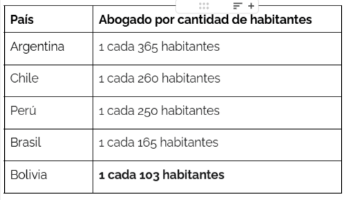 Argentina tiene un abogado cada 365 habitantes; Brasil, uno cada 165, pero en Bolivia, hemos roto el récord: tenemos 1 abogado por cada 103 habitantes.